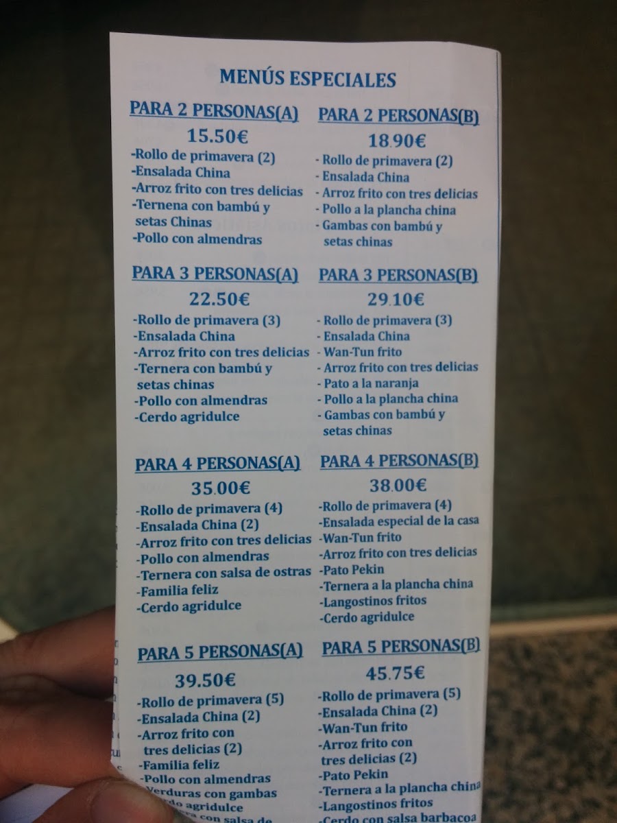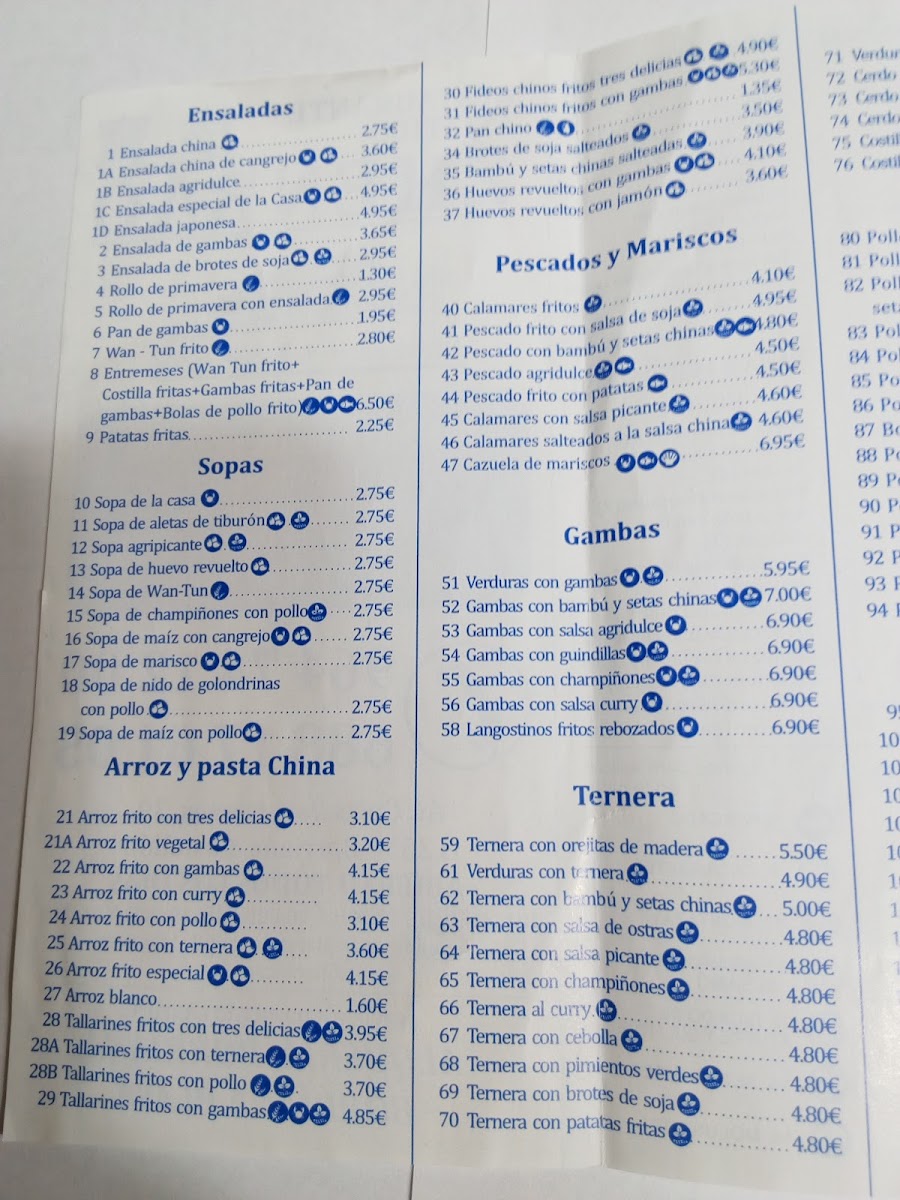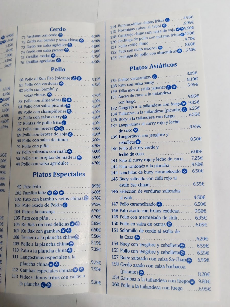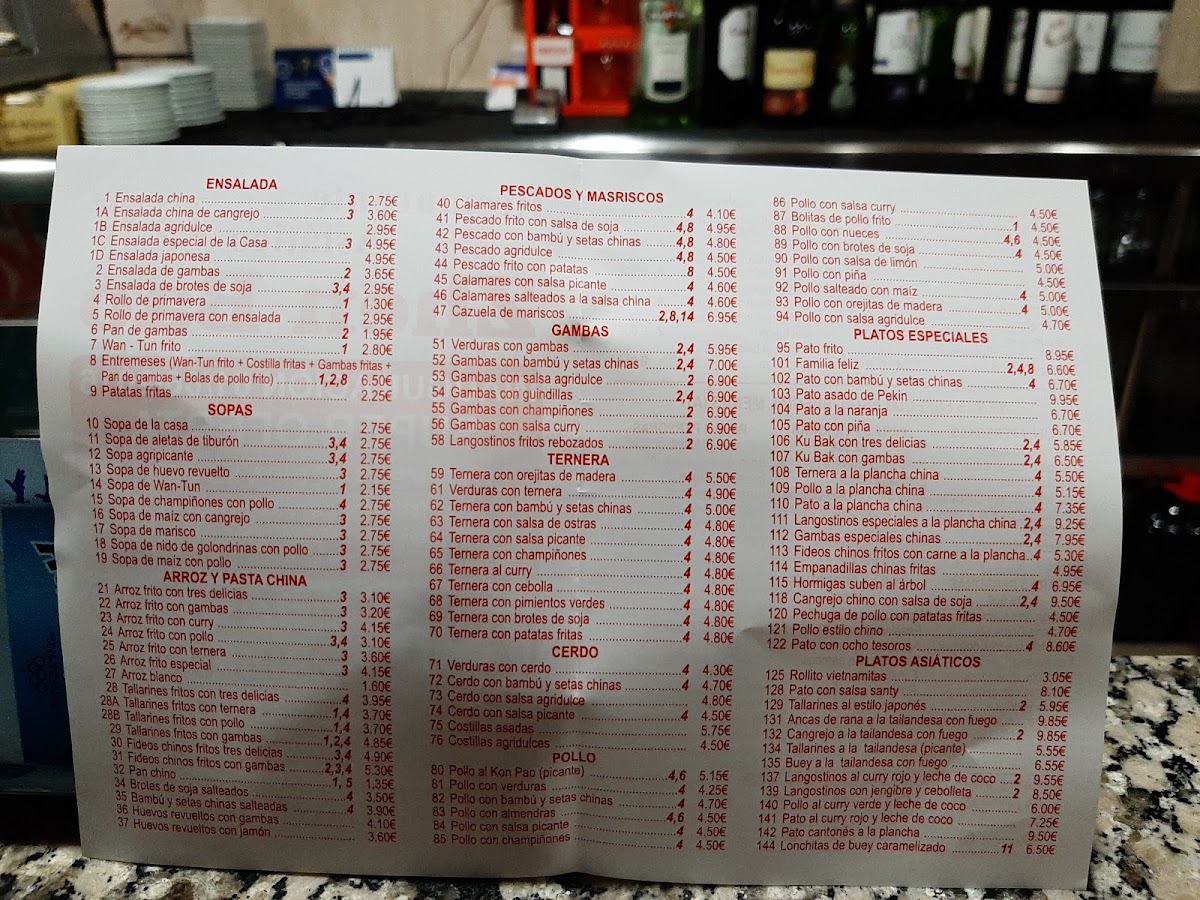 - Main Courses: Includes poultry, seafood, and meat dishes, for example Bolitas de Pollo, Pato Con Salsa, Ternera Con Setas Y Bambu, as well as noodle and rice options like Tallarines Con Gambas and Fideos Chinos Con Gambas.